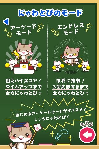 時間内にハイスコアを目指す「アーケードモード」と、3回失敗するまでとことん飛び続ける「エンドレスモード」が用意されている。