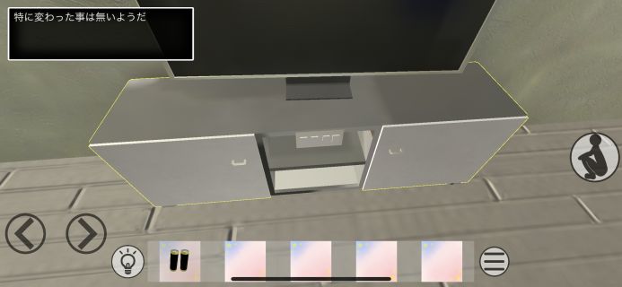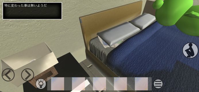 プレイモードは2種類あり、イージーモードでは画面左下の矢印ボタンで画面を切り替えながら探索できる通常の脱出ゲームのような操作性になっている。