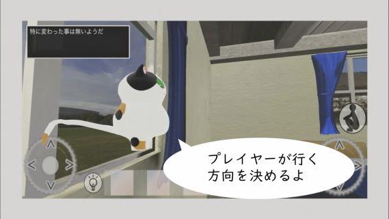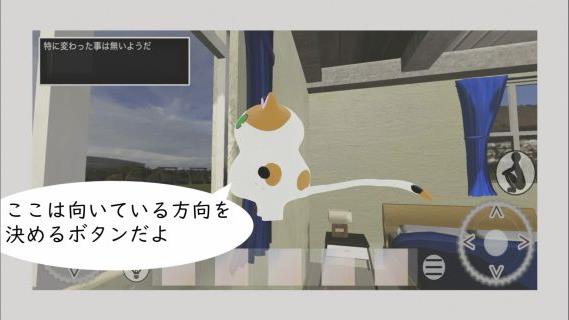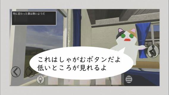 右の「しゃがむ」ボタンを押すと、猫の視点のような低い視点になりテーブルの下などを調べられるようになる。