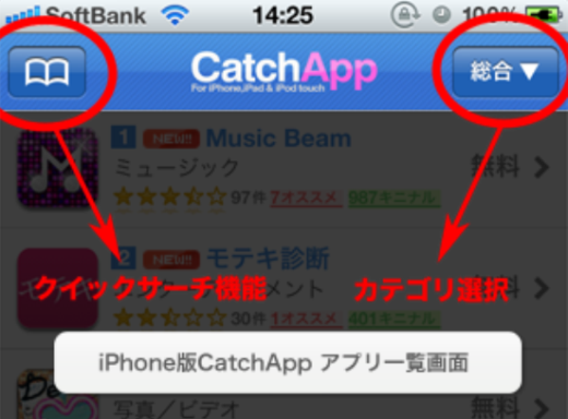 CatchAppのアプリ検索の指標となる「オススメ」と「キニナル」。