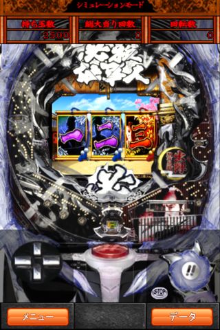 シミュレータの画面。各種ボタンやハンドルが画面下部に表示される。通常時の演出も再現されている。