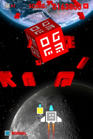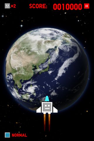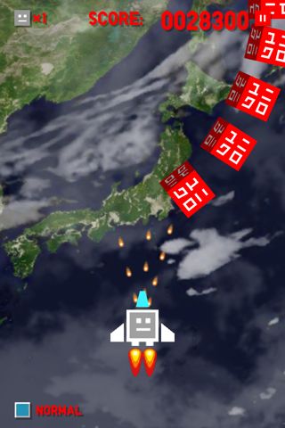 ビックロベーダーはソーシャルネットワークにも対応している。facebook や Twitter に情報をシェアすることができる。シェアしたくない場合は一番右のアイコンをタップしてプレイ。操作方法は簡単で画面をドラッグすると自機が動く。スマホ向けのシューティングゲームと一緒だ。