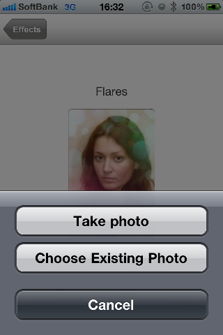 エフェクトを選択すると、直接カメラで写真を用意するか保存してある写真を選択するかを選ぶ。