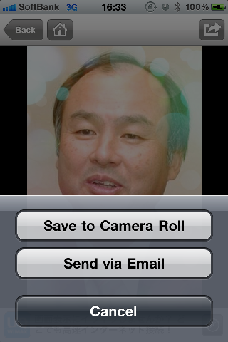 出来上がった合成写真は、カメラロールにjpg形式で保存するかメールに添付して送る事ができる。