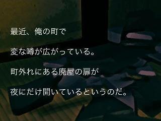 俺の住む町では、とある噂が広がっている。なんでも、廃屋の扉が夜だけたまに開いている事があるという。
