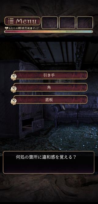 謎解きとは別にストーリー展開の中で選択を迫られる場面があり、間違った選択をすると精神力ゲージが低下していく。
