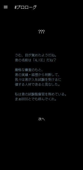 主人公「ALICE」は知らない場所で目を覚まし、「試験監督」と名乗る者から入社試験を受けさせられることに。