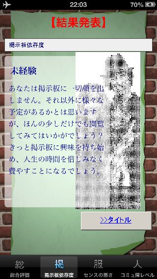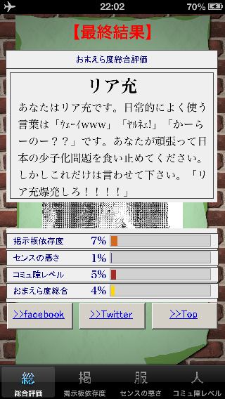 総合結果では下のタブで「掲示板依存度」「ファッションセンスの悪さ」「コミュ障レベル」を確認できる。