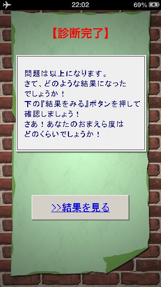 『日本全国1000万人の掲示板ファンに捧げるアプリ』となっていて「おまえら」という単語でピンとこない人には無縁のアプリに思えるが、結構的確に隠れていた性格などがむき出しに診断されるので是非試してみてほしい。