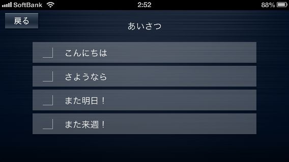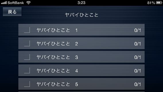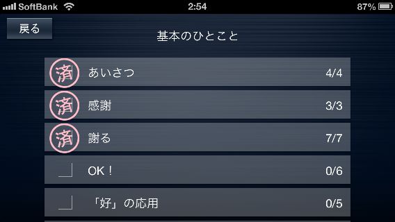 カテゴリは3つの階層に分かれていて、再生した単語には済マークが付く。
