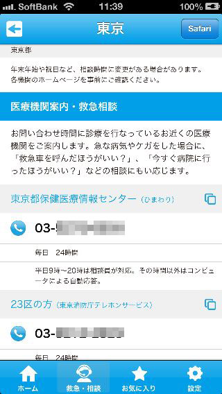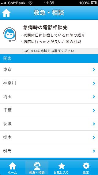 「緊急・相談」タブからは、全国の電話相談先一覧を表示。