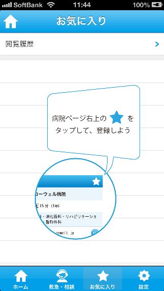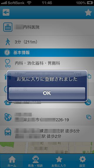 身近で通える病院などは★印をタップして「お気に入り」に登録することでいざという時に役立つように。