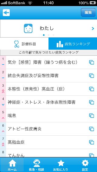 また、年齢・性別で気をつけたい病気のランキングや、年齢区分からの順位増減なども表示される。
