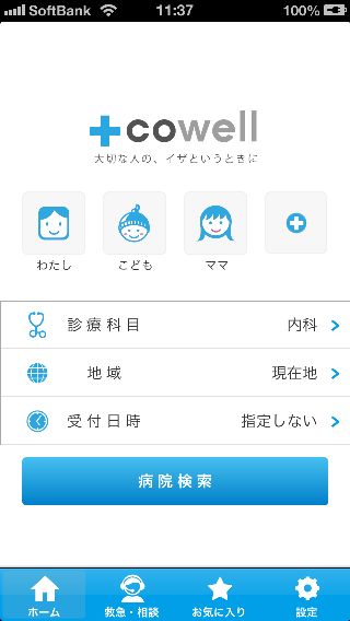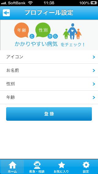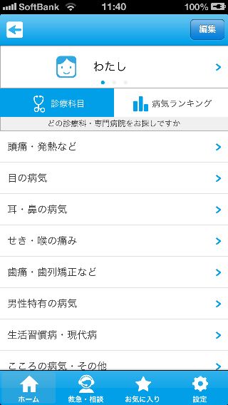 プロフィール登録することで年齢と性別にフィットした診療科目や専門診療のみを表示できるようになり、より素早く探すことが出来る。