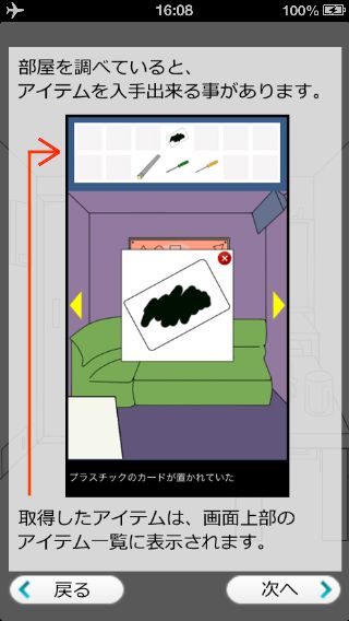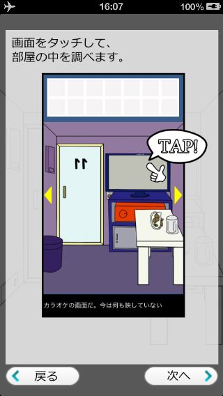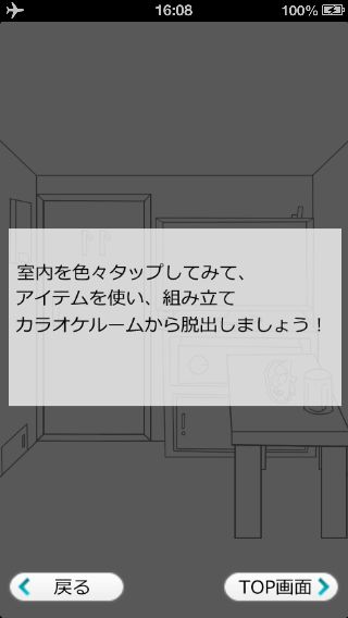 カラオケからの脱出 無料 5.0 評価する 送信する 失恋の傷を吹っ切るべく近所のカラオケに遊びに来たら、突然の停電で個室に閉じ込められてしまった! 早く脱出しなくては! ※ 公開停止 画面をタップしてアイテムやヒントを探し出す、オーソドックスなルール。 移動は画面左右をタップ、上部のアイテム画面でダブルタップすると詳細画面へ。 アイテム詳細画面で他のアイテムを使うと合成できることも。 ゲームをスタートするとオープニングが始まる。 攻略その1 攻略その2 攻略その3 攻略その4