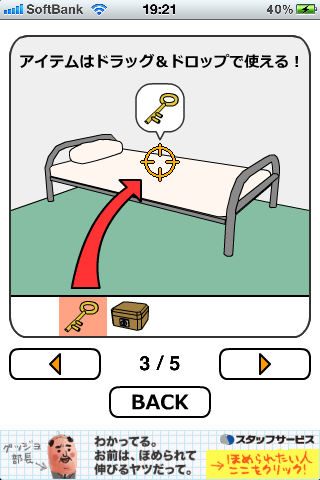 三角ボタンかスワイプで部屋の中を移動、アイテムはドラッグ&ドロップで使用する。